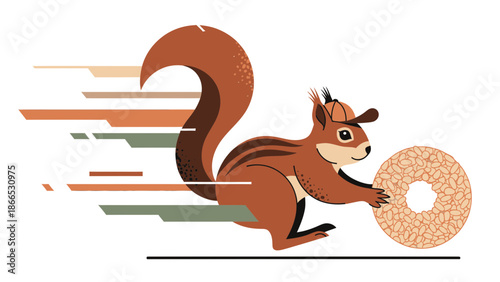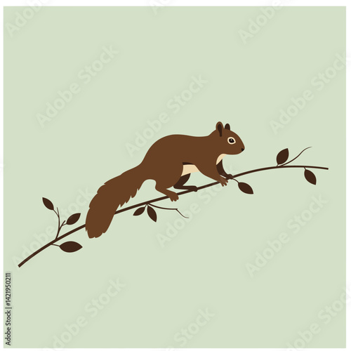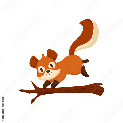 Roztomilá malá veverka skákání na větvi stromu plochý kreslený vektor. Šťastný lesní hlodavec s huňatým ocasem na větvičce ilustrace izolovaných na bílém pozadí. Rozkošný legrační divoké zvíře na ikonu větvičky