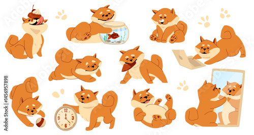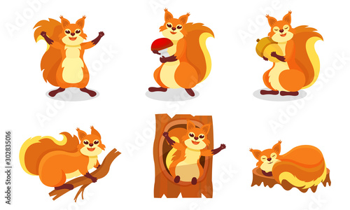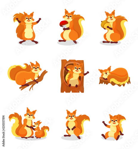 Roztomilý veverka kreslená postavička set, plochý vektor izolované ilustrace. Legrační zvířata spí, jíst žaludy, běh, hraní. Lesní divoká zvířata různé činnosti. Emoji, logo, nálepka.