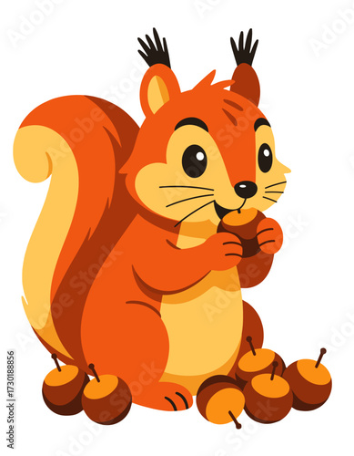 Roztomilý veverka sklizeň žaludy kreslený vektorové ikony. Legrační lesní zvíře hrdý na velkou sklizeň potravin připravených pro zimní ilustrace izolovaných na bílém pozadí. Koncept divokého života