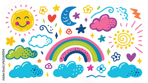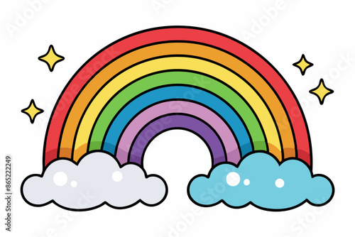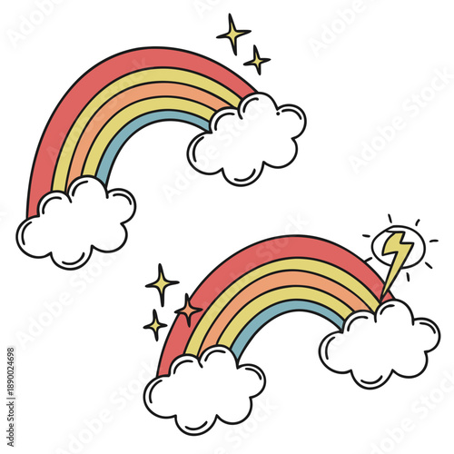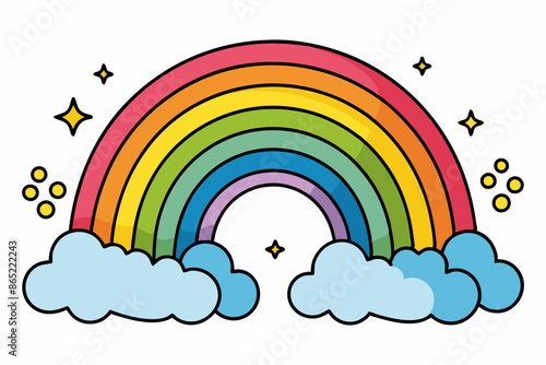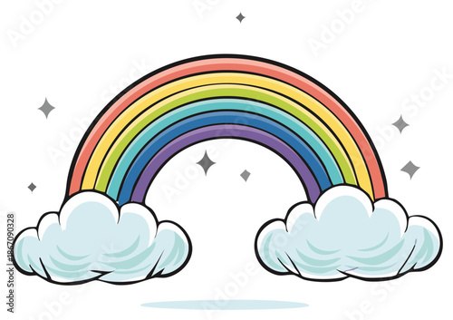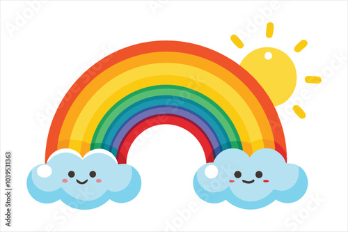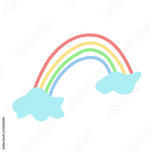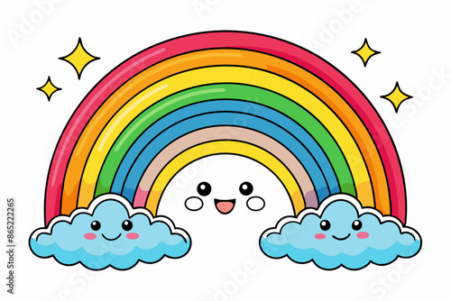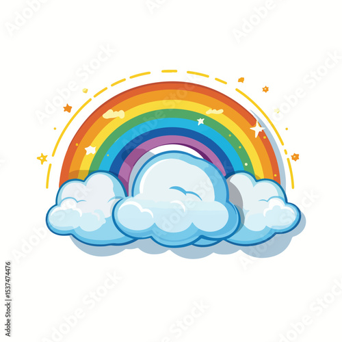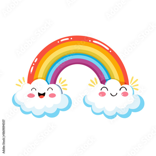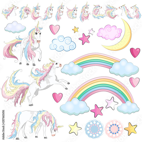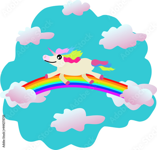 Roztomilý jednorožec, magické stvoření s jediným rohem, duhou a deštivými mraky. Vektorové ilustrace v moderním papírovém uměleckém stylu.