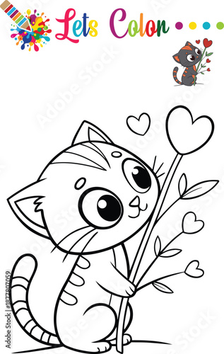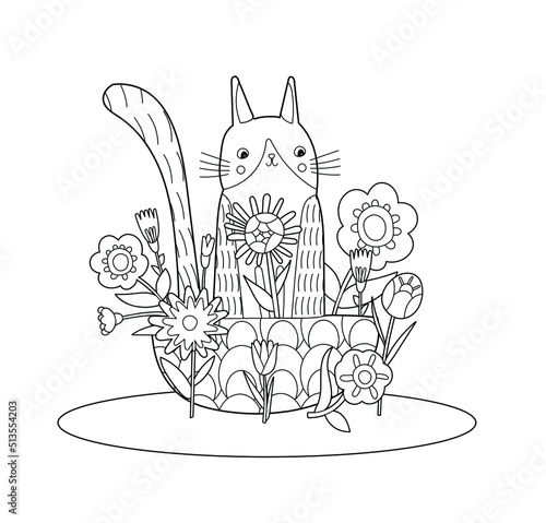 Roztomilý vektorové jarní kočka s květinovým košem. Kreslený legrační kotě zvíře ikona ilustrace pro blahopřání design. Šťastný pet s jarní pozvání izolovaných na bílém pozadí