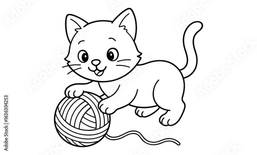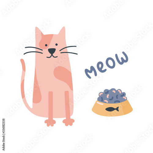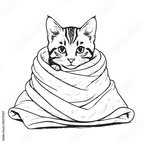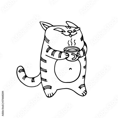 Zimní kočka zabalená do deky vektorového pohledu zezadu. Roztomilý pet zvíře ikona ilustrace. Legrační kotě charakter sedí vedle šálku pytel. Doodle design pro pozdrav chladné období karty izolované na bílém