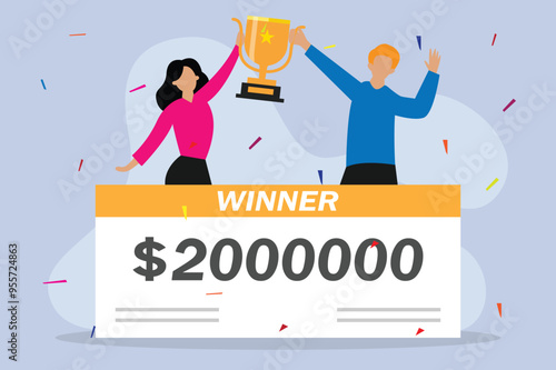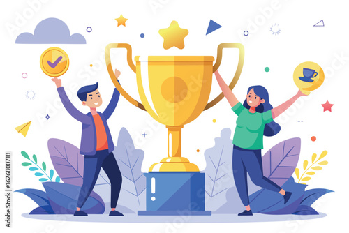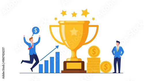 E-sportovní turnaj, vektorové ilustrace. Dva profesionální hráči hrají online videohru před obrazovkami počítačových monitorů a mezi nimi obrovský pohár ocenění. Koncept cybersportu pro webový banner atd.