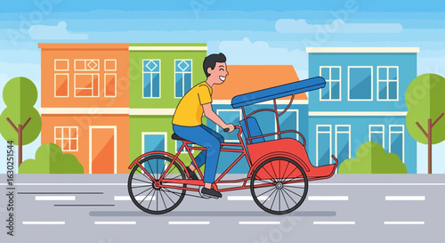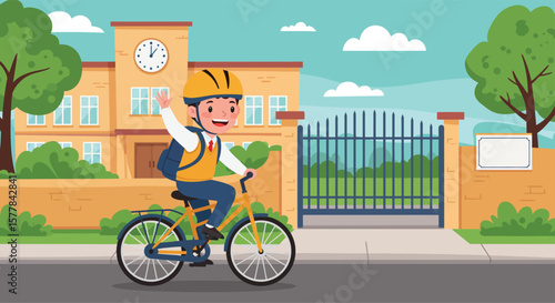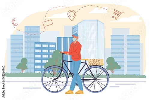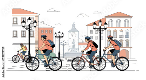 Vektorová ilustrace dvou cyklistů jezdících na kolech ve městě. Sportovní vybavení, helma, rukavice, brýle, tenisky a jízdní kola. Městská krajina. Plochý design