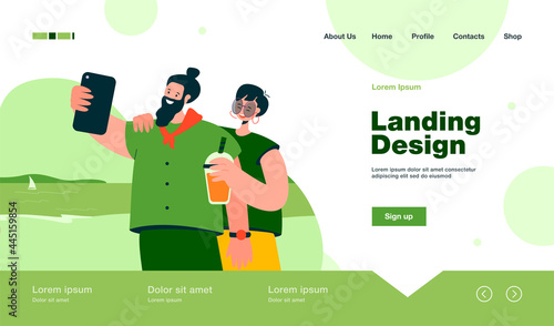 Šťastný otec s selfie s dcerou procházky v parku, ploché vektorové ilustrace. Táta a dítě tráví čas společně. Vztah rodičů a dětí, šťastné otcovství a rodičovství. Aktivita Den otců.