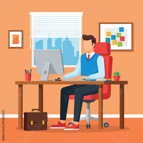 Život. Obchodní muž pracující na přenosném počítači sedí u stolu v kanceláři, ploché vektorové ilustrace. Pracovní doba, interiér pracoviště. Každodenní rutina, každodenní činnosti.