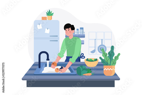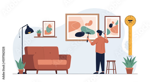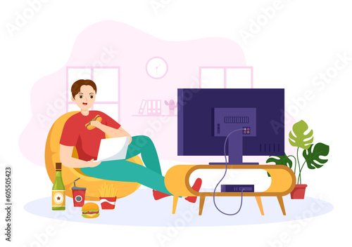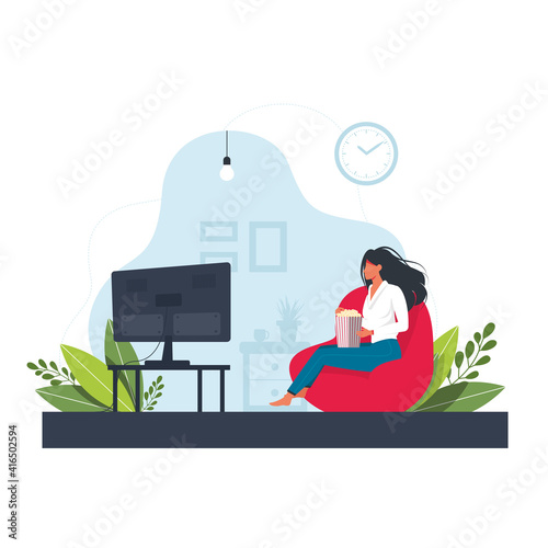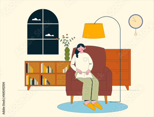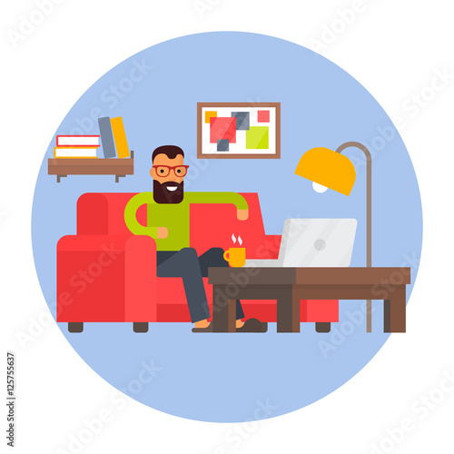 Život. Mladá žena probuzení, sedí na posteli s šálkem kávy, láhev s vodou a přenosný počítač v dopoledních hodinách, ploché vektorové ilustrace. Denní ranní rutina, každodenní činnosti, návyky.