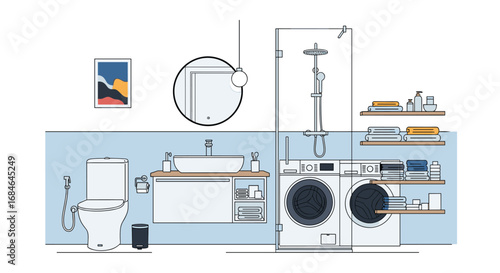Život. Mladý muž ve sprše v koupelně, ploché vektorové ilustrace. Denní ranní rutina, každodenní činnosti.