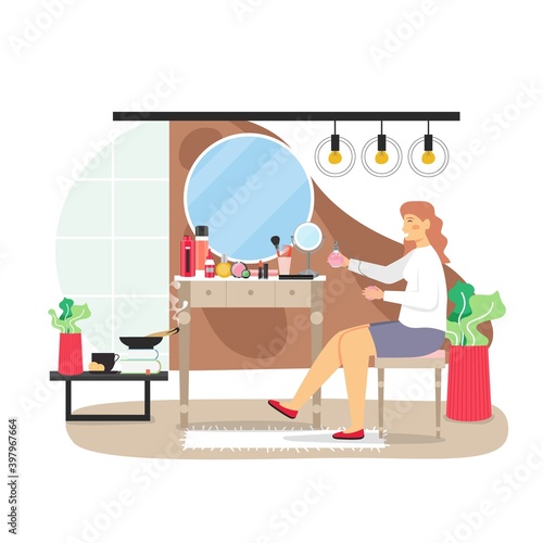 Život. Mladá žena dělá make-up v dopoledních hodinách, ploché vektorové ilustrace. Denní ranní rutina, každodenní aktivity, kosmetické návyky.