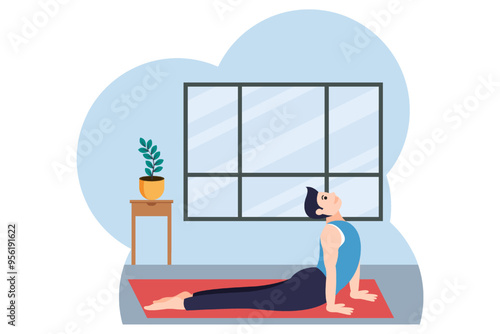 Život. Mladá žena dělá cvičení jógy, ploché vektorové ilustrace. Každodenní rutina, každodenní činnosti. Sport, fitness online. Domácí jóga. Aktivní a zdravý životní styl.