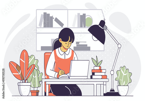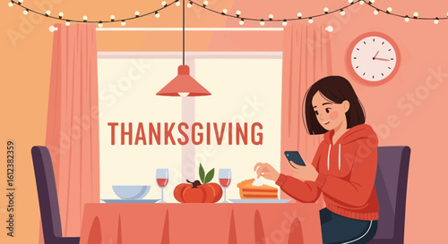 Život. Mladá žena snídá doma, ploché vektorové ilustrace. Šťastná dívka sedí u stolu, jíst, pít kávu a pomocí smartphonu. Denní ranní rutina, každodenní činnosti.
