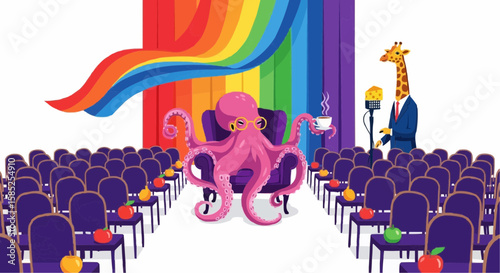Vektorová ilustrace tanečního baletního představení. Baletní tanečníci muži a ženy s hudebníky vystupujícími na jevišti plochý styl designu.