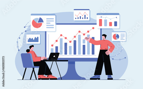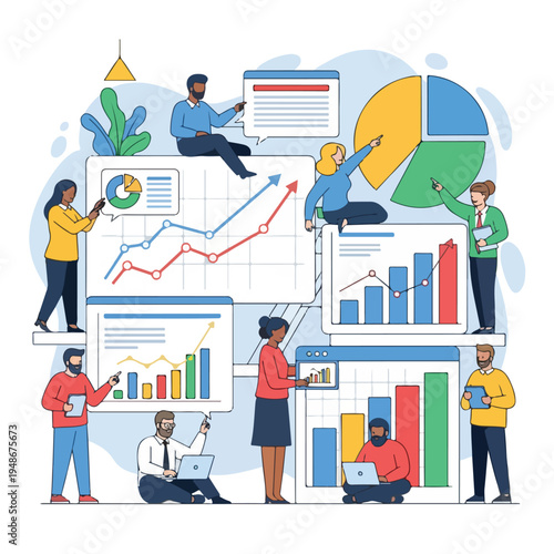 Datové analytiky, mikro mužské a ženské postavy analyzující statistická data analytických grafů na obrazovce tabletu, vektorový plochý design ilustrace. Business analytics, analýza finančních dat.