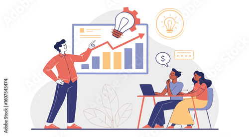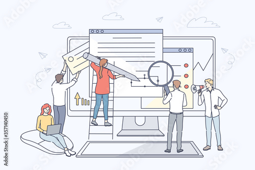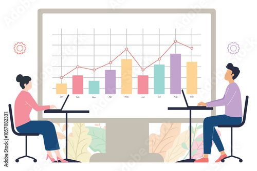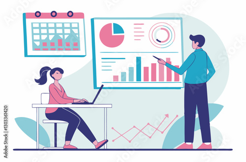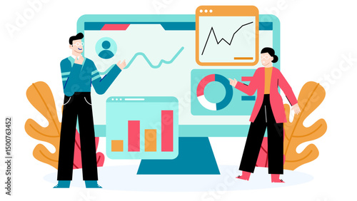 Datové analytiky, mikro mužské a ženské postavy analyzující statistická data analytických grafů na obrazovce tabletu, vektorový plochý design ilustrace. Business analytics, analýza finančních dat.