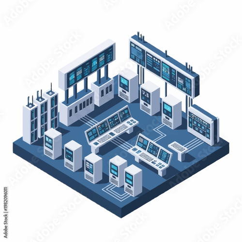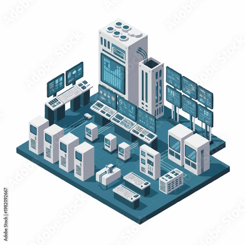 Klimatizační zařízení datového centra, ploché vektorové izometrické ilustrace. Chladicí systém pro řízení ventilace a teploty v serverovně.