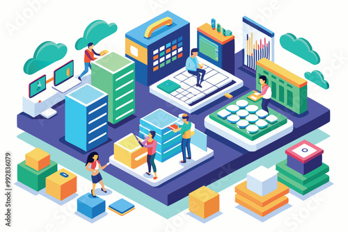 Klimatizační zařízení datového centra, ploché vektorové izometrické ilustrace. Chladicí systém pro řízení ventilace a teploty v serverovně.