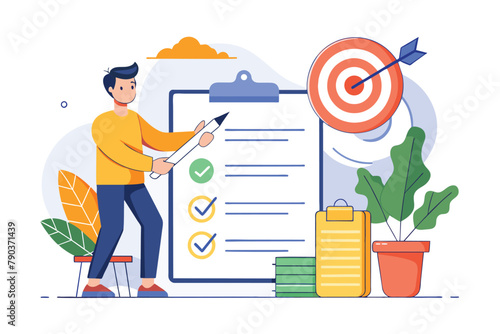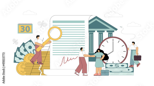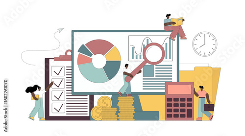 Micro mužské a ženské postavy office lidé budování obrovský koláčový graf, shromažďování statistických údajů a vytváření zprávy, prezentace, vektorové ploché ilustrace. Plán, sběr a analýza dat.