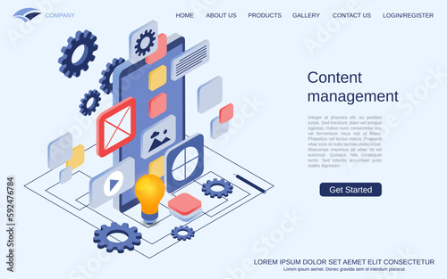 Návrh vstupní stránky pro správu dat, šablona banneru webových stránek, izometrická ilustrace plochého vektoru. Lidé interagují s grafy, analyzují data na stolních počítačích, přenosných počítačích, tabletu, mobilním telefonu.