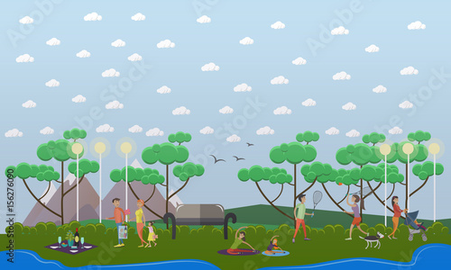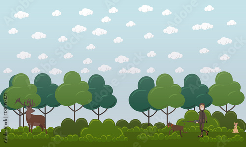 Koncept lovu jelenů vektorová ilustrace. Jelen, lovec s brokovnicí nebo puškou a lovecký pes plochý styl designové prvky. Koncept venkovní sportovní aktivity.