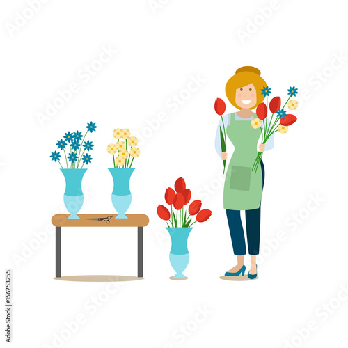 Vektorové ilustrace ženy květinářství s květinami. Delivery people concept flat style design element, ikona izolovaná na bílém pozadí.