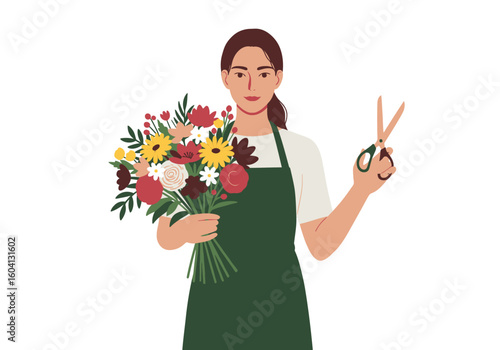 Vektorové ilustrace ženy květinářství s kyticí květin. Delivery people concept flat style design element, ikona izolovaná na bílém pozadí.