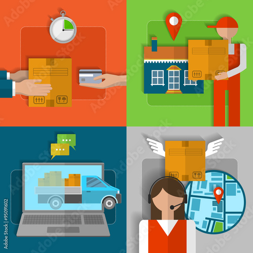 Dodávka, skladové regály, pracovníci nakladače s kartonovými krabicemi, vektorové ilustrace. Přepravní a doručovací služby, skladová logistika a přepravní koncepce pro webový banner, webovou stránku atd