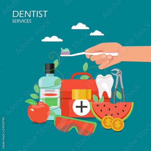 Zubař služby koncept vektorové ploché ilustrace. Ruční zubní kartáček se zubní pastou, ústní vodou, zdravým zubem, lékárničkou, zubními nástroji. Zubní péče a zdraví zubů plakát, banner.