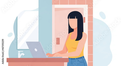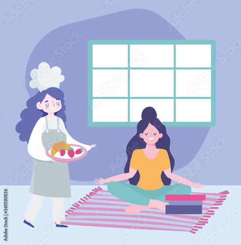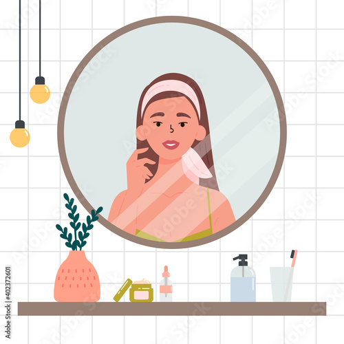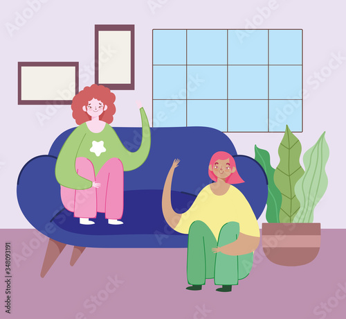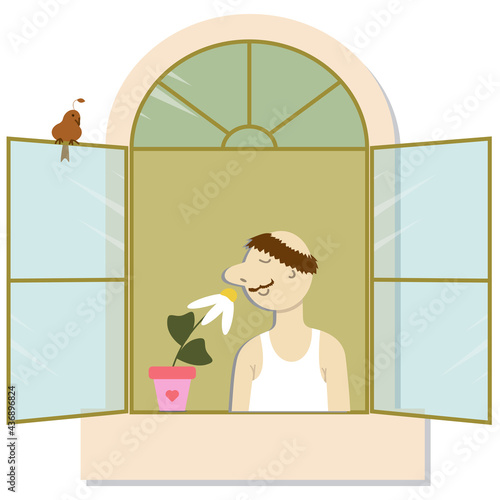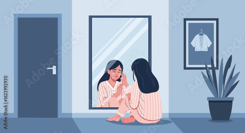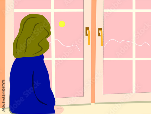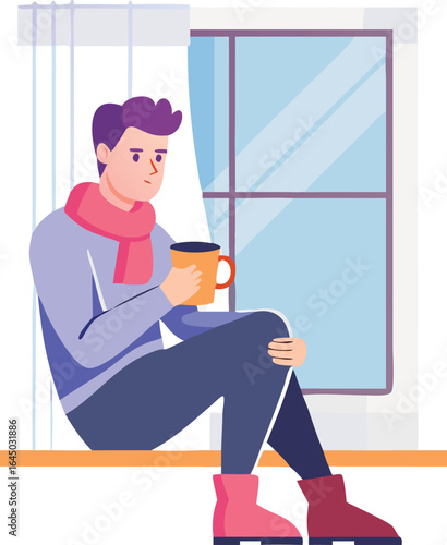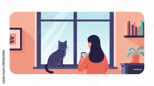 Depresivní mladá dívka sedící na okenním parapetu se svou krásnou kočkou. Vektorové ploché styl designu ilustrace.