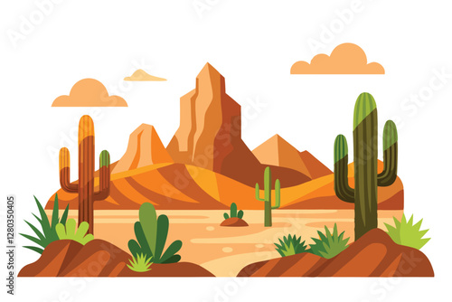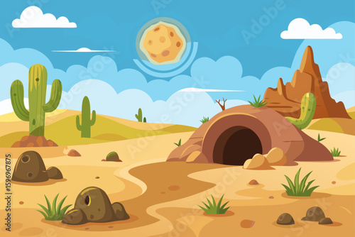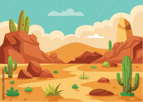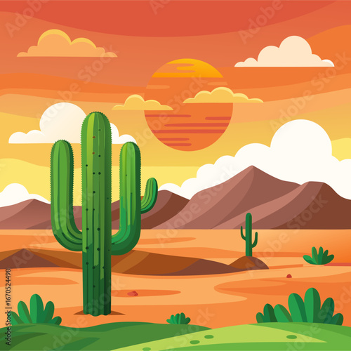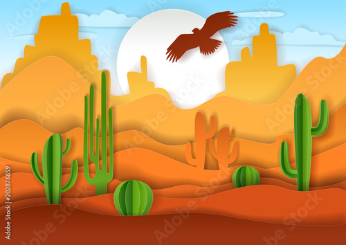 Pouštní krajina s Kaktusy a létajícím orlem. Vektorové ilustrace ve stylu papírového umění.