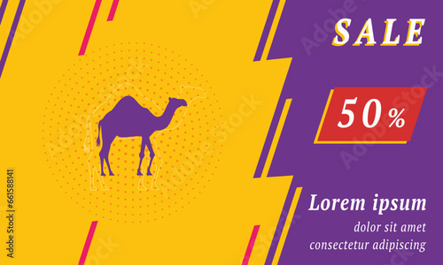 Desert trip vector webová šablona, design vstupní stránky pro vývoj webových stránek a mobilních stránek. Silueta velblouda řezaného papírem s karavanem ještěrky v poušti Sahara. Cestovní ruch cestování velbloudí jízda.