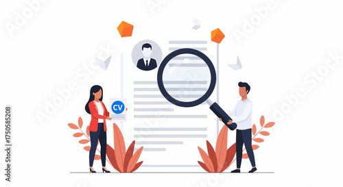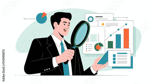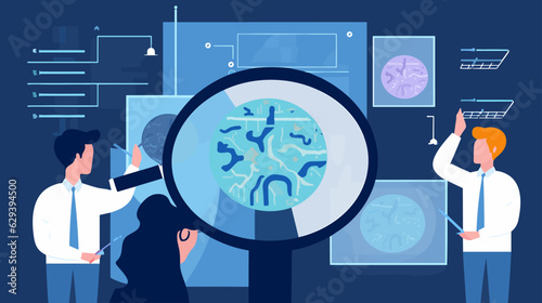 Vektorová ilustrace velké lupy a malých soukromých detektivů, kteří drží lupu, fotografují, dívají se dalekohledem, chodí se psem. Koncept detektivních služeb pro webový banner atd.
