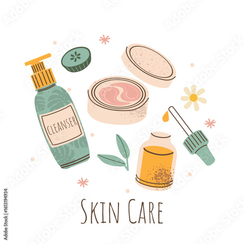 Tělo kůže Kosmetika vektor. Oční gel, balzám, krém na opalování v lahvích, tubách a sklenicích ilustrace. Organický kosmetický přípravek pro péči o pleť a hygienu. Koncepce propagace a reklamy