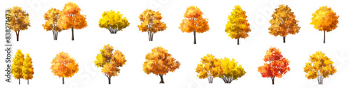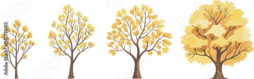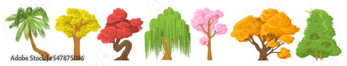 Zahrada, les a park strom vektorové ilustrace. Izolovaná dřevěná sada. Kvetoucí, stálezelené, tropické exotické nebo podzimní rostliny pro zahradní úpravy a herní konstruktér