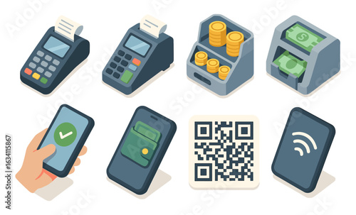 Různé platební metody set. Lidské ruce drží digitální gadget, pomocí kreditní karty a pos terminálu pro bezkontaktní placení, psaní bankovního šeku, nákupy pomocí mobilní technologie NFC