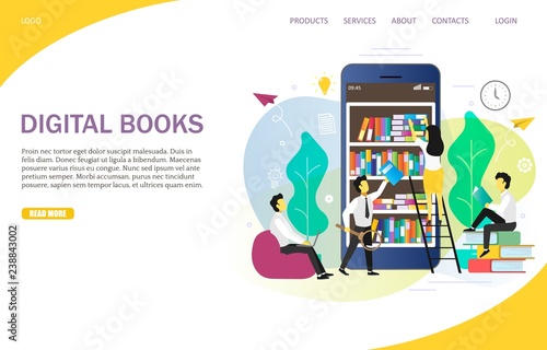 Šablona webových stránek vstupní stránky digitálních knih. Vektorové ilustrace lidí, kteří si vybírají knihy ze smartphonů. Ebook knihovna koncept.