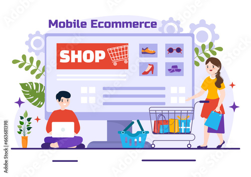Muž nákup a žena čtení novinový časopis on-line v mobilním telefonu novinový stánek, vektorové ploché ilustrace. Digitální novinový stánek koncept s mužskými a ženskými kreslenými postavičkami čtenáři zpráv.