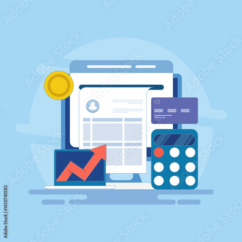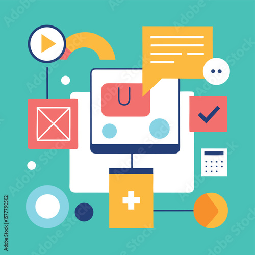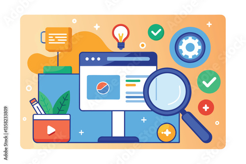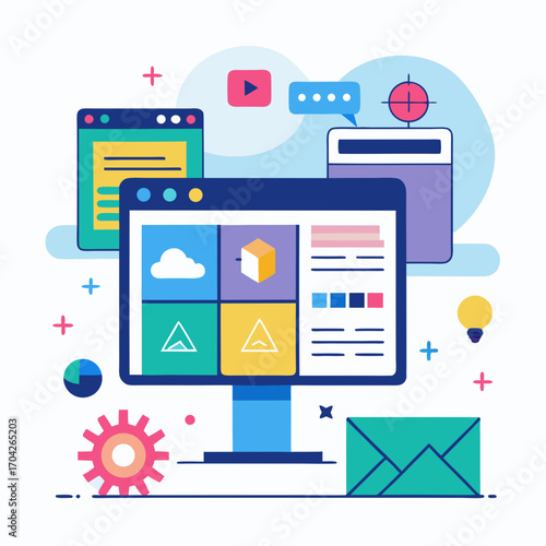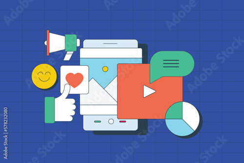 Digitální obrazovka s prvky mediálního a sociálního marketingu, koncept 3D vektorové ilustrace. Video přehrávač, žárovka, seo analýza dat s grafem, ikona zpráv. Kreativní nápad, obchodní technologie.
