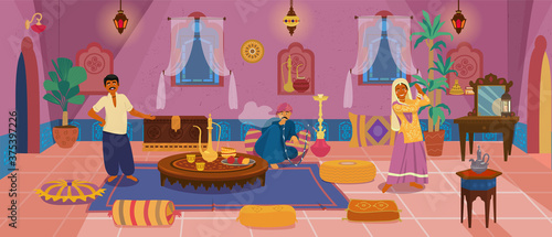 Vektorové ilustrace interiéru restaurace s návštěvníky pití vína a čtení menu, zatímco sedí u stolů, číšníci a servírky při objednávce, servírování jídel. Plochý design.