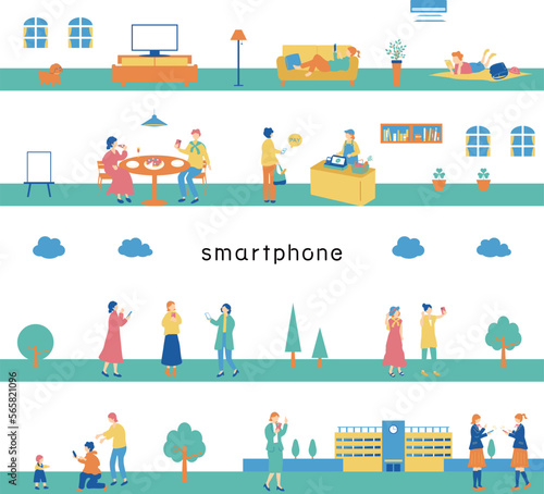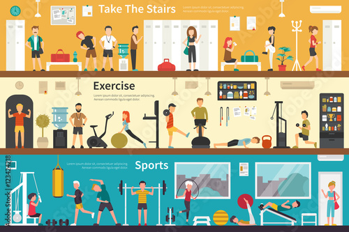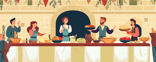 Interiér restaurace Vector s recepční, návštěvníci na večeři, číšník a servírka, kteří objednávají a podávají jídla. Plochý styl designu ilustrace.