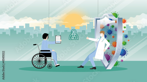 Handicapovaný muž na vozíku objednává kávu v kavárně. Vektorová ilustrace konceptu přístupného prostředí. Handicapovaný muž sledoval městský život z okna v kavárně.