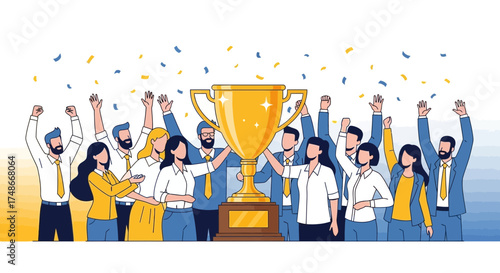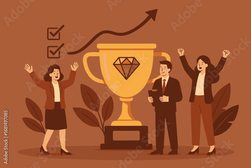 Šťastný muž a žena na invalidním vozíku drží obrovský pohár zlaté trofeje, vektorové ploché ilustrace. Zdravotně postižení slaví vítězství, obchodní úspěch. Koncept dosažení obchodního cíle.
