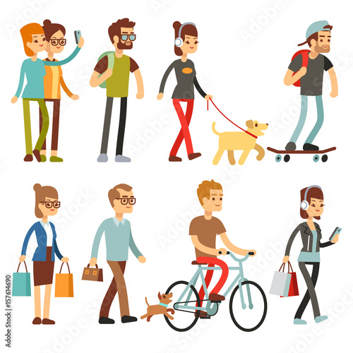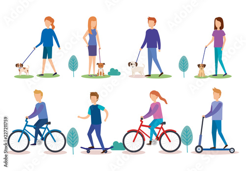 Ikona osoby se zdravotním postižením. Vektorové ploché ilustrace izolovaných na bílém pozadí. Lidé používající pohybové pomůcky chůze rám, invalidní vozík, běžecké čepele, berle, protéza. Slepý s holí, vodící pes.