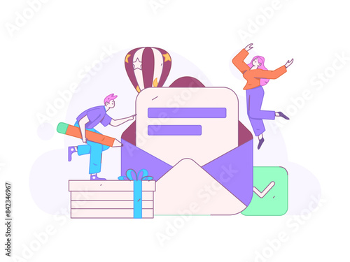 Slevová karta, muž drží dárkovou krabičku, ploché vektorové ilustrace. Bonusová dárková karta, kupón, poukaz, získejte odměnu, uplatnit dárek, výhody, věrnostní program.