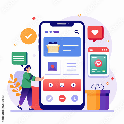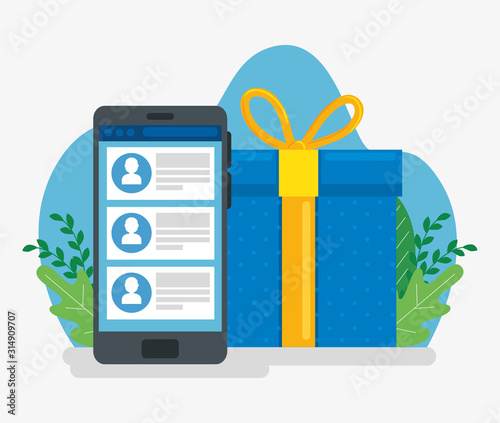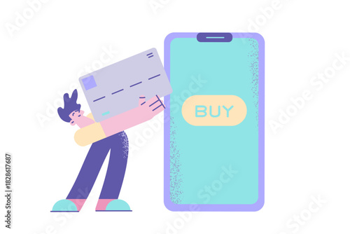 Slevová karta, muž drží dárkovou krabičku, ploché vektorové ilustrace. Bonusová dárková karta, kupón, poukaz, získejte odměnu, uplatnit dárek, výhody, věrnostní program.