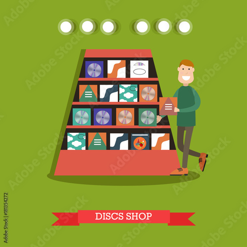 Vektorová ilustrace pracovníka v rádiu muž výběru CD v hudebním obchodě pro rozhlasové programy. Disky obchod koncept designový prvek v plochém stylu.