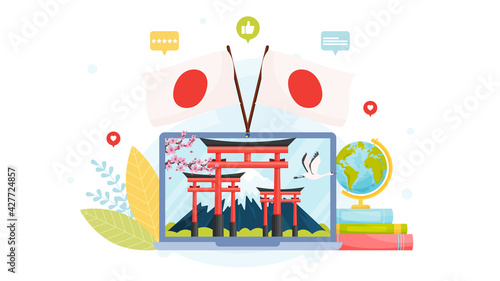 Obrovské pilulky láhev, šálek horkého čaje, teploměr pro tělesnou teplotu, mikro lékař ošetřující pacientka dostala chřipku, vektorový plochý obrázek. Léčba virů chřipkové choroby, péče o nemocné pacienty.