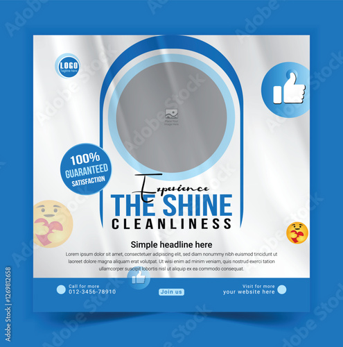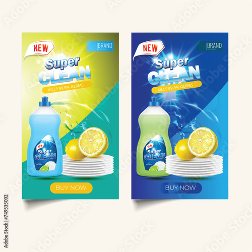 Vektorové 3D ilustrace modré barvy mytí nádobí tekutý produkt reklama. Design etikety z plastové láhve. Reklamní plakát značky mycího prostředku nebo mýdla na mytí nádobí.