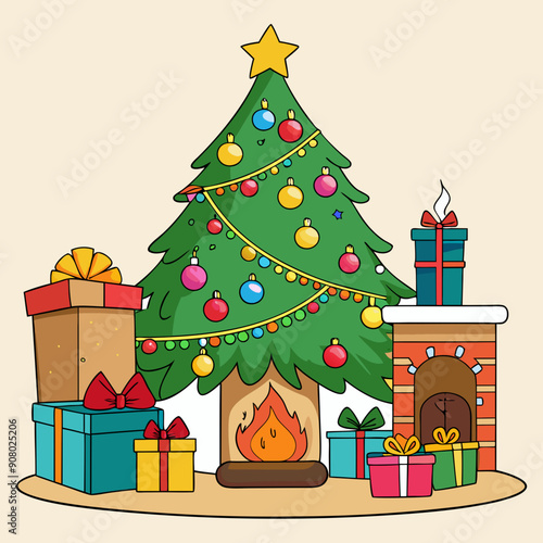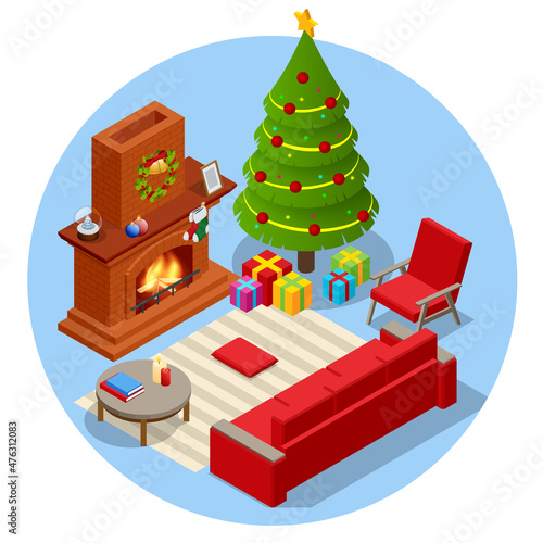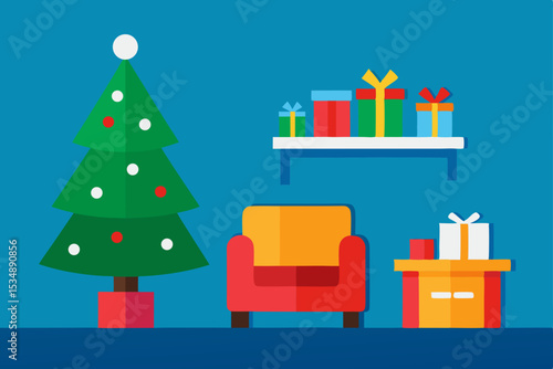 Bílý displej pódium maketa set s dárkové krabičky, papír řezané vánoční strom, dekorace, vektorové ilustrace. Vánoční studio, platforma, stojan, pódium pro dárek, propagace kosmetického produktu.