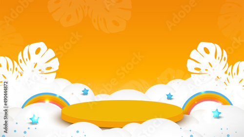 Bílý kulatý displej pódium, vrstvený papír řezané květiny, listy, vektorové ilustrace. Květinové pozadí pro reklamní plakát produktu, banner, leták atd.