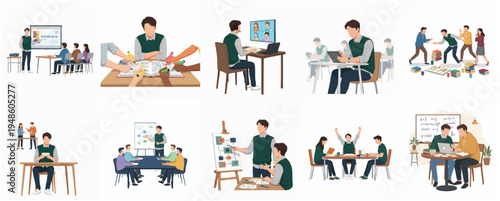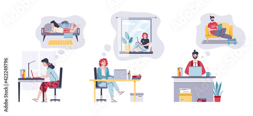 Lékař a pacient, muž, žena kreslená postavička set, plochý vektor izolované ilustrace. Lékař terapeut vyšetření v kanceláři, JIP nebo intravenózní terapie v nemocnici, lékárna obchod, lékařské laboratorní test.